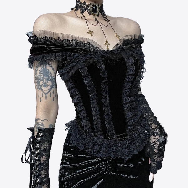 Off-Shoulder Velvet Blouse : Add a touch of luxury to your wardrobe with this off-shoulder velvet blouse. Its soft velvet and elegant cut emphasize femininity, creating a sensual and sophisticated look. Also check out other gothic blouses available in our store.