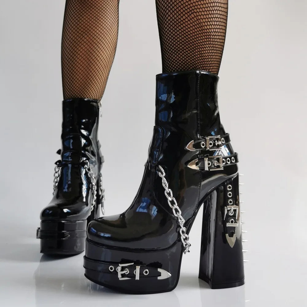 - Bogate zdobienia – metalowe detale i unikalne wzory podkreślają gotycki charakter obuwia.